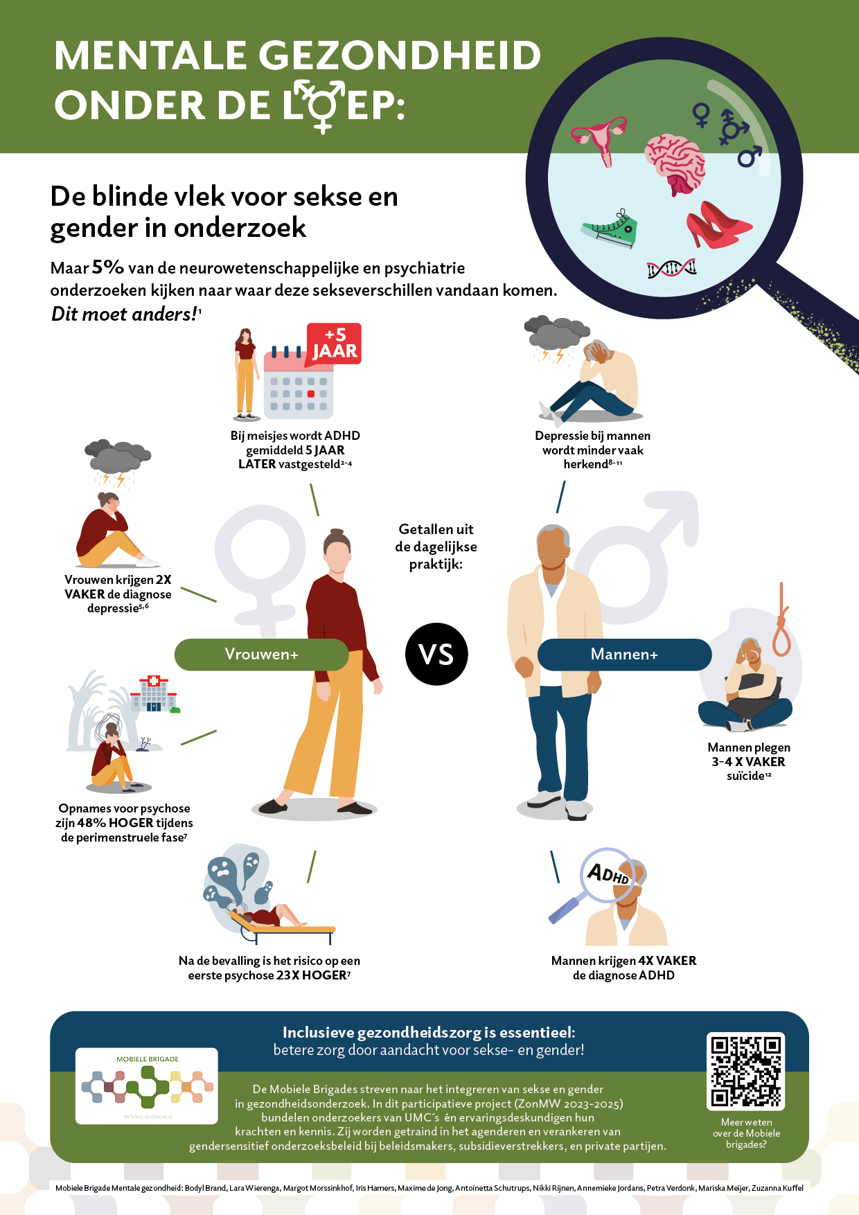 We zien in de bevolking grote verschillen tussen mannen+ en vrouwen+ in mentale gezondheid, zowel in het voorkomen van deze aandoeningen als het ziekteverloop. Aan de ene kant zijn er meer vrouwen+ met diagnoses van depressies, angststoornissen en slaapproblematiek. Aan de andere kant zien we meer mannen+ met ADHD, schizofrenie en verslavingsproblemen. Ook zien we dat er vaker gemiste diagnoses of misdiagnoses zijn die bij mannen+ en vrouwen+ verschillen. Bij vrouwen+ wordt ADHD en schizofrenie vaker gemist of duurt het langer tot zij de juiste diagnose krijgen. Bij mannen+ worden mentale problemen minder vaak besproken en daardoor mogelijk over het hoofd gezien.